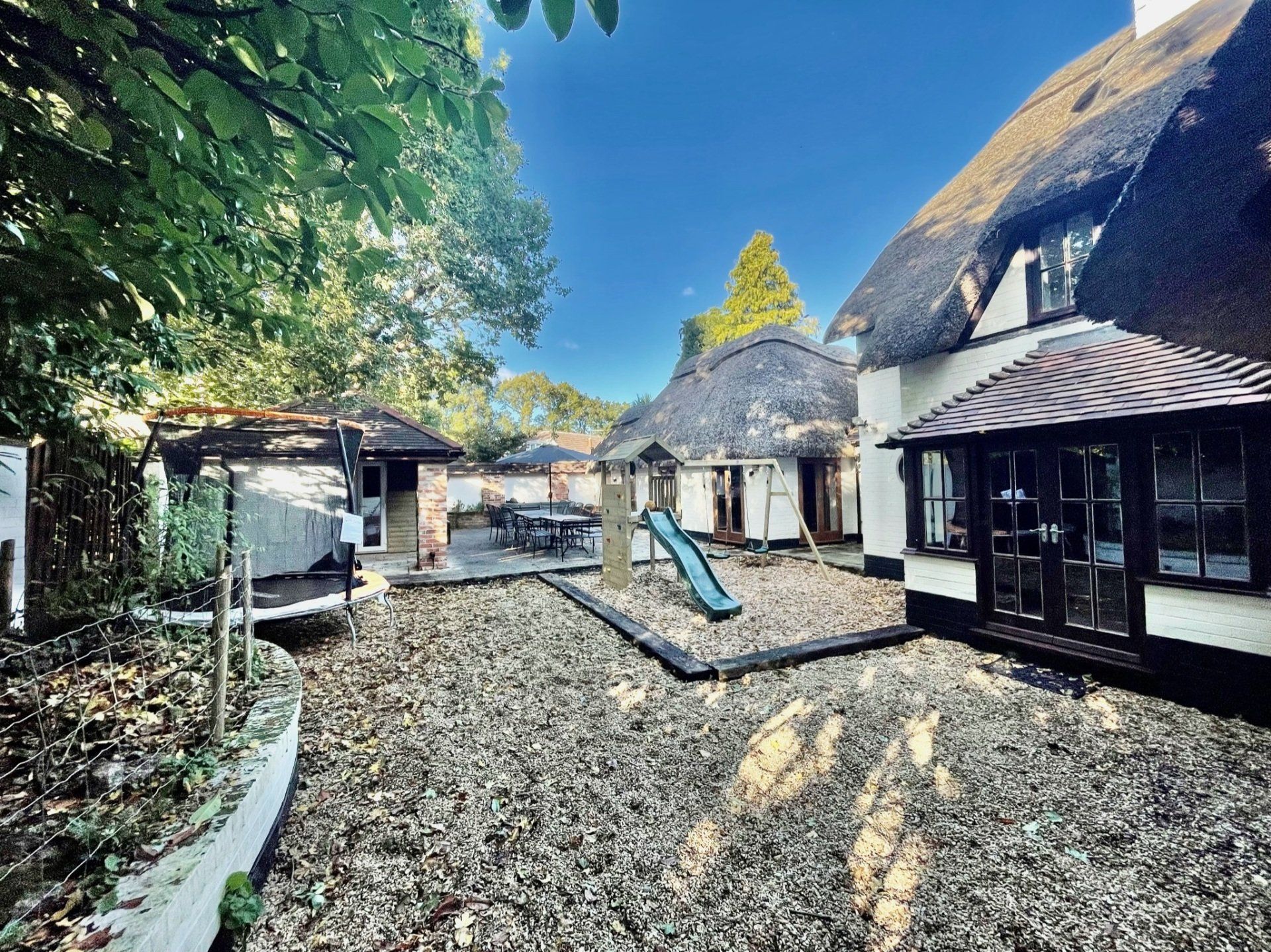 - Front garden laid to lawn, secluded patio courtyard area with trampoline, childrens' play frame, hot tub and glamping hut.