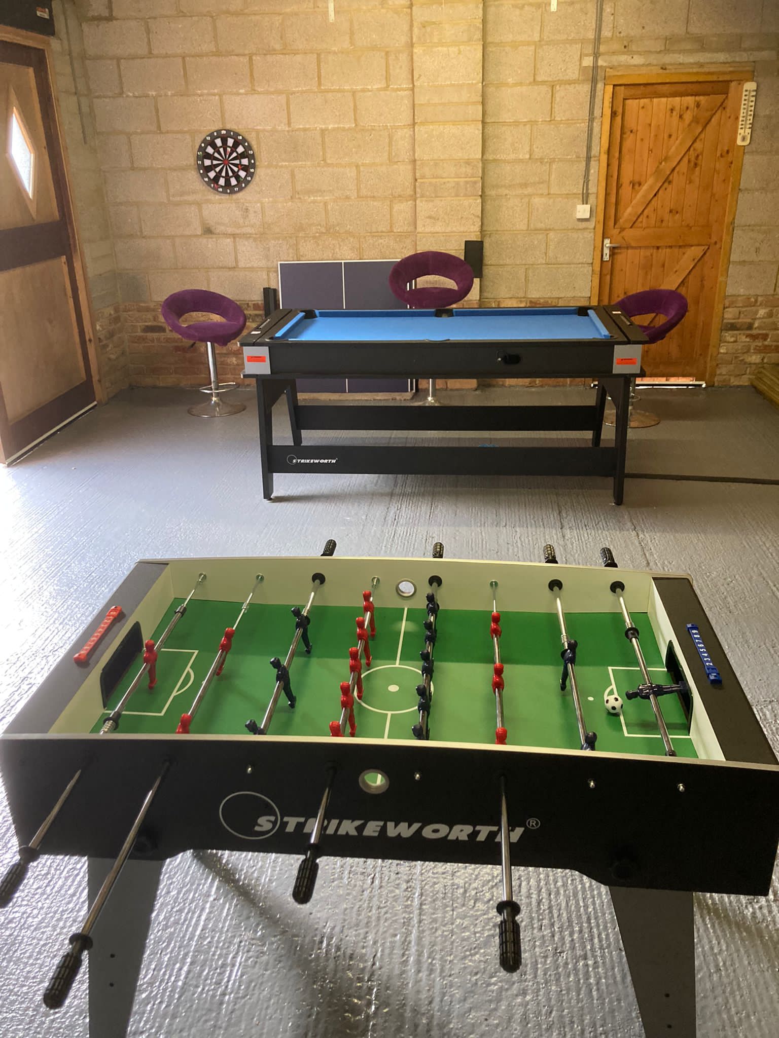 Games Barn with darts, table tennis, pool table, table hockey and table football.